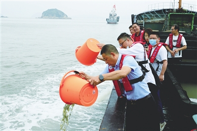 6月中旬,玉环市渔业部门开展近海增殖放流活动,2540万尾大黄鱼苗放流大海。自2006年以来,该市连续17年开展增殖放流活动,共放流大黄鱼、黑鲷、真鲷、乌贼等鱼苗共计1.2亿万尾,使当地的近海渔业资源得到持续恢复。倪建军 摄