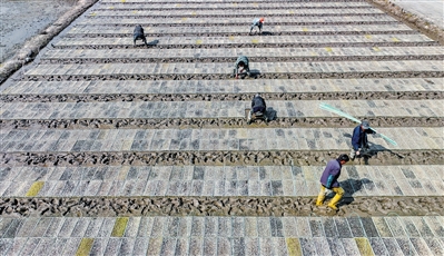 3月8日,宁波市海曙区农户将出芽秧盘有序摆入水田。张昊桦 摄