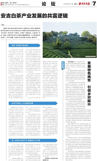 如果说“茶圣”陆羽在湖州写《茶经》、宋徽宗在《大观茶论》首提白茶是安吉白茶的千年文脉,神奇的北纬30度是安吉白茶的地缘优势,那么“有为政府+有效市场”“母商标+子商标”“单品网店+众品网店”“东部+西部”,则是安吉白茶产业发展的共富逻辑导图。本文通过解析安吉白茶“一片叶子致富一方百姓”的内在规律,总结经验、指导未来。