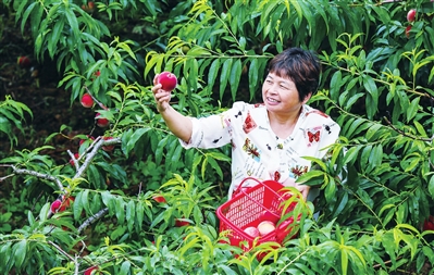 近日,地处高山深处的淳安县文昌镇王家源村老方家庭农场的水蜜桃成熟了,一个个红彤彤的“仙桃”垂挂在枝头,沉甸甸的,迎来丰收季。由于高山温差大,水蜜桃的品质好,又脆又甜,深受消费者喜爱。图为果农正在采摘成熟的果实。