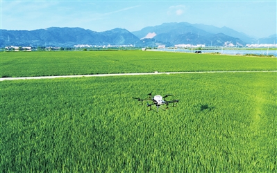 植保无人机对水稻田进行施肥作业。(资料图片)