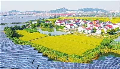 眼下已进入晚稻收割时,在长兴县吕山乡雁陶村,金色稻田与民居、河道、光伏相映成景,构成一幅美丽金秋画卷。