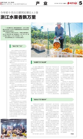 今年是浙江水果出口的丰年。尽管在全国范围内,浙江并不算水果大省,但数据显示,今年1至10月,浙江水果出口额达5.5亿元,同比增长4.1倍。