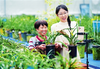 “双十一”临近,兰花等农产品卖得火爆。在长兴县龙山街道川步村兰花博览园内,返乡创业大学毕业生王琳忙着用视频直播推介兰花,通过物流发往全国各地。图为10月28日,王琳(右)正通过网络直播销售兰花。
