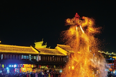 农历正月初一,新昌县澄潭街道梅渚古村举行水上火壶表演,吸引了众多游客驻足观赏。