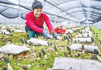 2月11日,在金华市婺城区白龙桥镇董村椒椒农业有限公司的菌棚内,种植户正忙着采收今年首批羊肚菌。