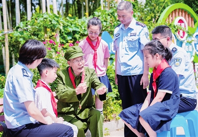 7月24日,长兴县雉城街道金陵社区联合南门社区开展“聆听老兵故事 传承红色基因”主题活动。图为退伍老兵方文贵在金陵社区讲述参军保家卫国的故事。 陈海伟 摄