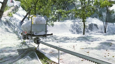 岛石镇仁里村的王德民一家,午饭后拿着几个编织袋不紧不慢地上山。“今年,我们家采取了‘张网采收’,我们是来‘收’核桃,不是‘打’核桃。”王德民说。果不其然,到了山核桃林地,首茬自然落果的山核桃已顺着斜坡归集到收集桶,不到两小时,他们就收满了5袋。一旁等候的单轨运输机随即启动,载着果实缓缓下山,无缝接驳到公路边的农用车上,直运脱蒲现场。