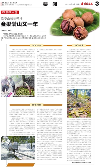 “作为全国唯一的‘中国山核桃之都’,临安从事山核桃的种植农民有10万人,有SC认证加工企业300余家。近年来,临安以三产融合为目标,打造集生产加工、销售展示、观光旅游、科学研究于一体的现代化数字化工厂、山核桃脱蒲水籽交易中心、白牛电商中心,促进产业创新发展。”临安区农业农村局有关负责人介绍。在今年的中国果品区域公用品牌价值评估中,“临安山核桃”品牌价值达49.43亿元,位居全国坚果类榜首。