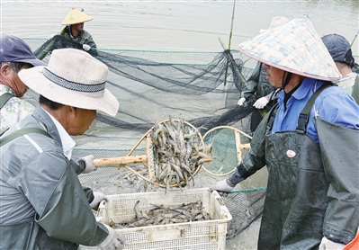 省淡水水产研究所综合试验基地工作人员捕捞罗氏沼虾“南太湖3号”种虾。