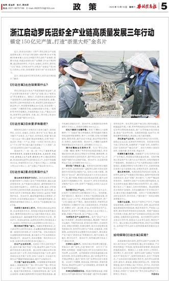 近日,我省出台《浙江土特产·罗氏沼虾全产业链高质量发展三年行动方案(2025—2027年)》(以下简称《行动方案》),旨在全面提升罗氏沼虾产业规模、质量与效益,构建全国领先的产业集群。《行动方案》明确,通过推动良种化、生态化、设施化、品质化、数字化“五化”联动,力争到2027年,实现全产业链总产值150亿元的核心目标,持续增强“浙里大虾”的市场竞争力。