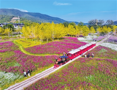 11月5日,长兴县小浦镇十里古银杏长廊,银杏林与古宅民宿、花海交相辉映,构成一幅美丽乡村风景。图为游客在花海里拍照赏景。