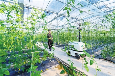 浙江绿迹农业科技有限公司的无人巡检车在大棚内采集蔬菜生产数据。