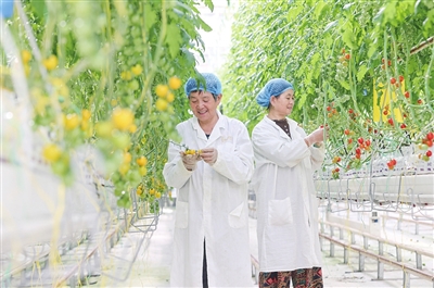 在湖州市阜溪街道龙胜村水木蔬菜工厂,工人在智能温室采摘彩色小番茄。