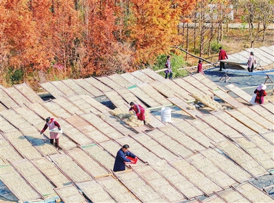 近年来,长兴县和平镇毛家店村通过加工粉皮,解决当地留守人员在家门口创业就业的问题。目前,该村从事粉皮加工销售的村民有60多人,粉皮加工已成为村民增收致富的重要产业。图为村民正在晾晒粉皮。