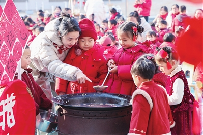 1月23日,德清县新市镇第三幼儿园开展“品民俗 迎腊八”主题活动,小朋友们通过辨识食材、煮腊八粥、拓印新年“福”字等形式,感受传统文化的魅力。图为幼儿园老师正在给小朋友介绍煮腊八粥的食材。