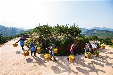 与此同时,在庆元县竹口镇黄坛村,农户正在甜橘柚园内采摘成熟果实。该项目是省级庆元帮扶团组牵头开展的重点农业帮扶项目之一,通过建设仓储、分拣中心,不仅让这里成为庆元最大的甜橘柚产区,也极大地促进了当地甜橘柚产业发展。目前,庆元县甜橘柚种植面积达2.1万余亩,年产量1.86万吨,年产值达2.05亿元。
