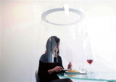 法国巴黎,一名女士在用有机玻璃做的罩子里用餐。这是设计师克里斯托弗·杰尼根设计的,它可以将食客手部以上全部罩住,在新冠疫情下减少暴露。(据中国新闻网 2020年5月22日)
