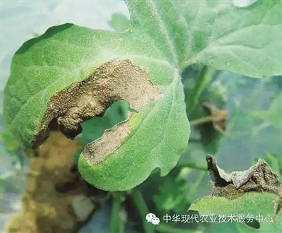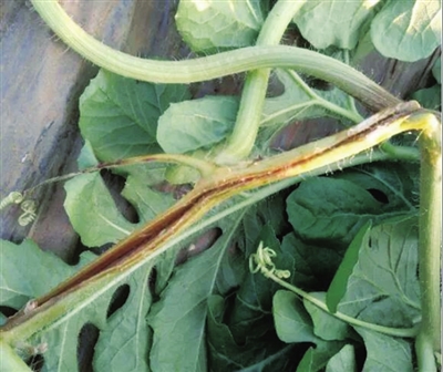 西瓜蔓枯病又叫黑腐病,为真菌性病害,俗称“流黄水病”,主要侵染茎蔓和叶片,一般以叶片受害为重。叶片受害时,最初出现褐色小点,有不明显的同心轮纹,空气潮湿时,全叶枯死。西瓜整个生育期均可发病,并引起叶片、茎蔓枯死和果实腐烂。幼苗茎部受害时,初现水渍状小斑,后环绕幼茎;叶部发病多从叶缘开始,产生“V”字形或半圆形黄褐色大病斑,病斑易干枯破碎。果实上发病,表面干裂,内部木栓化,卷须受害后迅速失水变褐枯死。