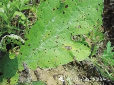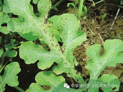 西瓜斑点病又称叶斑病,为真菌性病害,多发生在西瓜生长中后期,主要危害叶片。叶片上病斑较小,一般直径2—7毫米,病斑的边缘褐色至紫褐色,近圆形或不规则形,灰色至灰褐色,病斑中间有1个白色中心,微有轮纹,外围可见1个黄色晕圈,区别于其他叶斑病。