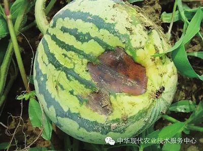 果实顶部凹陷,变为黑褐色,后期湿度大时,遇腐生霉菌寄生会出现黑色霉状物。在天气长期干旱的情况下,果实膨大期水分、养分供应失调,叶片与果实争夺养分,引起果实脐部大量失水,使其生长发育受阻;或者由于氮肥过多,引起西瓜吸收钙素受阻,使脐部细胞生理紊乱,失去控制水分的能力;或者施用激素类药物干扰了瓜果的正常发育,均易产生脐腐病。