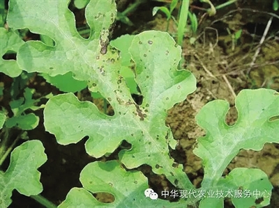 该病由真菌引起,主要危害叶片。发病初期,叶片出现水浸状小斑点,后扩展为圆形至近圆形暗褐色斑,边缘稍隆起,可引起全株叶片枯萎。果实发病时,初生水渍状暗色斑,后扩展成凹陷斑,引起果实腐烂。西瓜运输和贮藏期,该病可继续扩展,湿度大时,病部长出稀疏的黑色霉层。