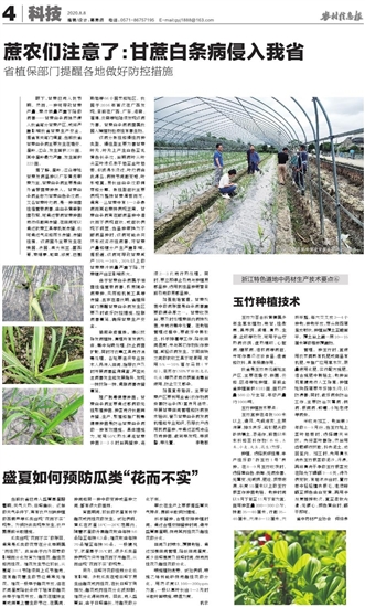 由于甘蔗白条病属于细菌性维管束病害,极易随染病蔗种、风雨和机械工具等传播,且存在潜伏期,省植保部门提醒甘蔗白条病发生区要及时做好防控措施,控制病害蔓延,确保甘蔗生产安全。