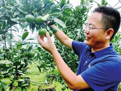| 韩东道在查看柑橘新品种长势。 |