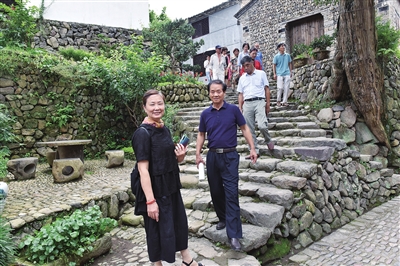 江南最大的孔子后裔集聚地磐安县盘峰乡榉溪村,近年来积极挖掘和利用深厚的历史古村落资源及良好的生态环境,着力发展文化旅游产业,助力乡村振兴,成为远近闻名的旅游打卡地。图为日前,游客在榉溪村游赏。