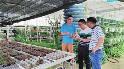 今年暑假期间,浙江农林大学的一些专家教授把实验室“搬”到了青山绿水间,深入田间地头忙于科技助农。图为近日,该校专家邵清松(中)来到温州金溪谷农业开发有限公司调研指导,建议企业发展林下经济,增设森林休闲康养服务、异业多产融合建设等。 陈胜伟 摄