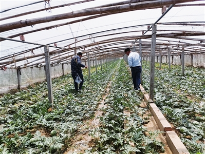 种子技术人员在田间检查西瓜杂株和病虫害情况,认真做好记录。 邹文雄 摄