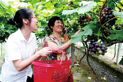 日前,开化县飞宇家庭农场的工人们正在采摘葡萄。今年,该农场在当地金融机构的贷款支持下,生态种植葡萄、樱桃、火龙果等水果,所产水果口感和品质好,俏销远近市场。齐振松 摄