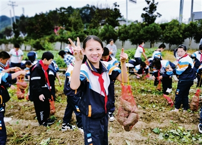 当天上午,学生们来到中国耕织图文化园,走进番薯地,开始收获之旅。大家撸起袖子收番薯,不一会儿袋子里就装满了大大小小的番薯,沉甸甸的。虽然弄得满身泥污,但每个人的脸上都洋溢着笑容。