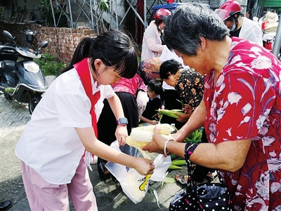 “卖玉米,卖玉米,大的一元一根,小的五毛一根。”“走过路过,不要错过,香甜玉米便宜出售!”当天,同学们将刚从地里收获的新鲜玉米搬到街头售卖。仅半个多小时,300多根玉米便销售一空。
