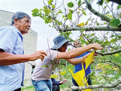 | 温岭市农业农村和水利局专家指导农户采取物理防治措施防治梨树病虫害。 |