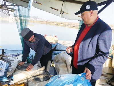 | 罗华明(右)向渔民了解水产养殖情况。 |