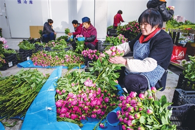 5月10日,在浦江县杭坪镇乌浆村,村民在包装刚采摘的芍药花蕾。近年来,杭坪镇专注芍药、郁金香、百合、绣球等花卉产业发展,持续扩大栽培规模,产值达到上千万元,成功播下共富之“花”。