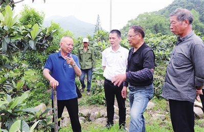 6月11日上午,来自省农科院浙东特色果树研究室主任、博士陈方永与省“春蚕奖”获得者、温岭市党代表赵子平一起来到温岭市温峤镇田头,指导果农科学管理果树。温岭市温峤镇种植果树8740亩,为提升果农种植水平,该镇专门成立特色果业共富工坊博士工作站,聘请陈方永为首席讲师。图为陈方永(左一)在温峤镇白岩下村批杷种植基地耐心解答果农提问。