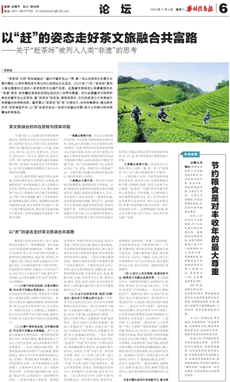 “赶茶场”又称“茶场庙庙会”,盛行于磐安玉山一带,是一场以古茶场为主要文化展示舞台,以茶叶等物资交易为中心的民俗文化活动。2022年11月,“赶茶场”被列入联合国教科文组织人类非物质文化遗产名录。这是磐安县有史以来最高层级的“非遗”项目,标志着区域性的茶民俗活动步入世界级殿堂。作为全国重点文物保护单位的磐安玉山古茶场,是“赶茶场”所在地,具有将茶叶、文化和旅游三大资源进行深度融合的独特优势。磐安要以“赶茶场”的“赶”为源动力,加快统筹谋划,强化有序开发,积极转型升级,以“赶”的姿态走出一条茶文旅融合发展、助力乡村振兴和共同富裕的新路径。