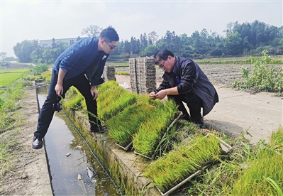 江山市农技推广中心工作人员在该市峰田家庭农场对水稻秧苗立枯病发生情况进行定损查勘。 姜伟 毛土有 摄