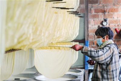 春节临近,诸暨市安华镇的传统年货——豆腐皮迎来销售旺季。最近村民都在加紧制作,供应节日市场。 徐昱 摄