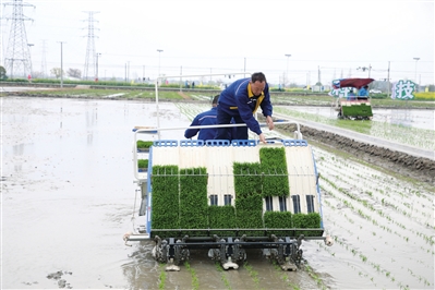 3月27日,在绍兴市上虞区戴氏家庭农场农田里,机声隆隆,人影穿梭,插秧机开足马力工作。