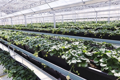 她先带着记者来到草莓园。现在正值草莓成熟季节,红的、粉的、白的草莓挂满枝头。郑锦飞一手提着垃圾桶,一手麻利地翻开草莓叶子,遇到畸形果——摘掉、看到匍匐茎——拔掉、有侧枝——打掉,不一会儿,垃圾桶就装满了。“虽然我们产业园已高度智能化,但这项工作还得用人工。”郑锦飞笑着说。