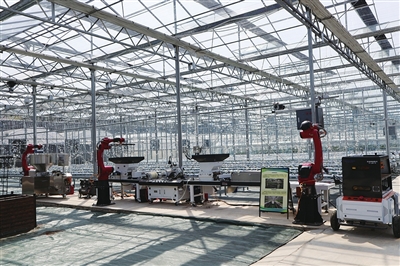 她告诉记者,“无人农场”集种苗繁育、新品种试种、智能控制、自动种植、自动采收于一体,总投资1100万元左右,占地3328平方米,主要承担成果转化、示范推广等功能。“无人农场”主要分为数字植物工厂区、果蔬新品种种植示范区、数字农业与智能装备展示区等若干区域。目前,种植示范区种植了2400株甜瓜、3700株番茄,外加3亩草莓;植物工厂里有18个苗床,除了甜瓜、番茄、草莓,还育有贝贝南瓜、玉米、生菜等秧苗。