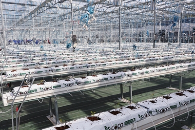 经过短暂的午休,郑锦飞又开始投入到下午的工作中。“我们这两天都忙着移栽甜瓜苗,今天还剩一点收尾工作。”在移栽机器人的帮助下,200株瓜苗从植物工厂被运到玻璃大棚的甜瓜种植区。郑锦飞熟练地将一株株瓜苗放进椰糠条内,差不多1个小时,移栽工作就完成了。