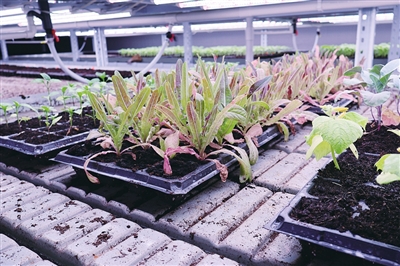 在去植物工厂路上,郑锦飞说:“为了让秧苗能更快地成长,我们把植物工厂白天的温度设置在30℃,原本40天才能完成的育苗工作,现在只需20天。”记者跟着郑锦飞走进植物工厂,一股热浪扑面而来,只见三排植物生长架整齐且紧凑地排列在一起,在灯光照射下,培养穴里的秧苗显得格外健壮。“用人工光源替代自然光,通过精准控制光的亮度和颜色,可以加快作物生长。因为空间密闭,管理起来也更加轻松。”进行简单的设备调整,巡园工作就结束了。