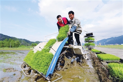 开化仙庭家庭农场负责人郑启庭正在用插秧机插种早稻。齐振松 摄