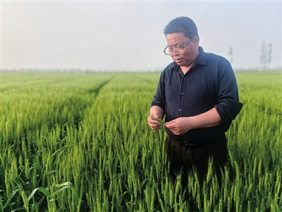 | 朱春弟在田间查看小麦长势。 |