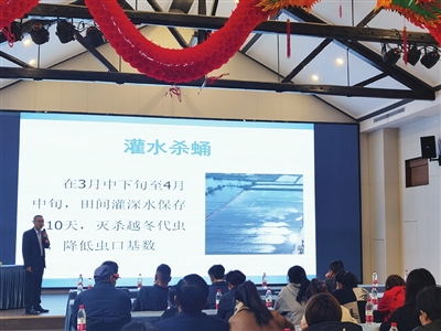 | 马祺在谢塘镇给种粮大户讲“稻麦主要病虫害的防控对策”。 |