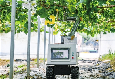 7月11日,在浦江县浙江圣炫农业科技有限公司的葡萄园内,一台智能采摘机器人穿梭于果园中,按设定好的采摘路线自动绕行避障,通过摄像头、机械臂、夹剪装置等,识别成熟的葡萄,从梗部末端进行采摘。该款葡萄采摘机器人去年投入使用,今年升级了轻薄化夹剪一体的“剪刀手”和智能导航系统,适用于不同梗长葡萄的采摘作业。